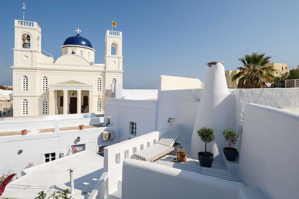The accommodation is located in the heart of the area “Finikia” of Karterados, which took its name from the huge palm tree that dominates there for over 60 years. Finikia is a very traditional settlement characterized by its quiet, picturesque, narrow alleys and the imposing orthodox Church of the Ascension. In one of these alleys, next to the Church of the Ascension, one finds Betty’s Home, which is only accessible by foot, by motorbike and four-wheeled motorbike since the narrow alleys do not allow the passage of a car. However, just outside the centre Finikia, 2 minutes away from Betty’s Home, there are roads accessible by car and available parking, while there is a second road, which leads to Fira, Karterados’ centre and the bus station .